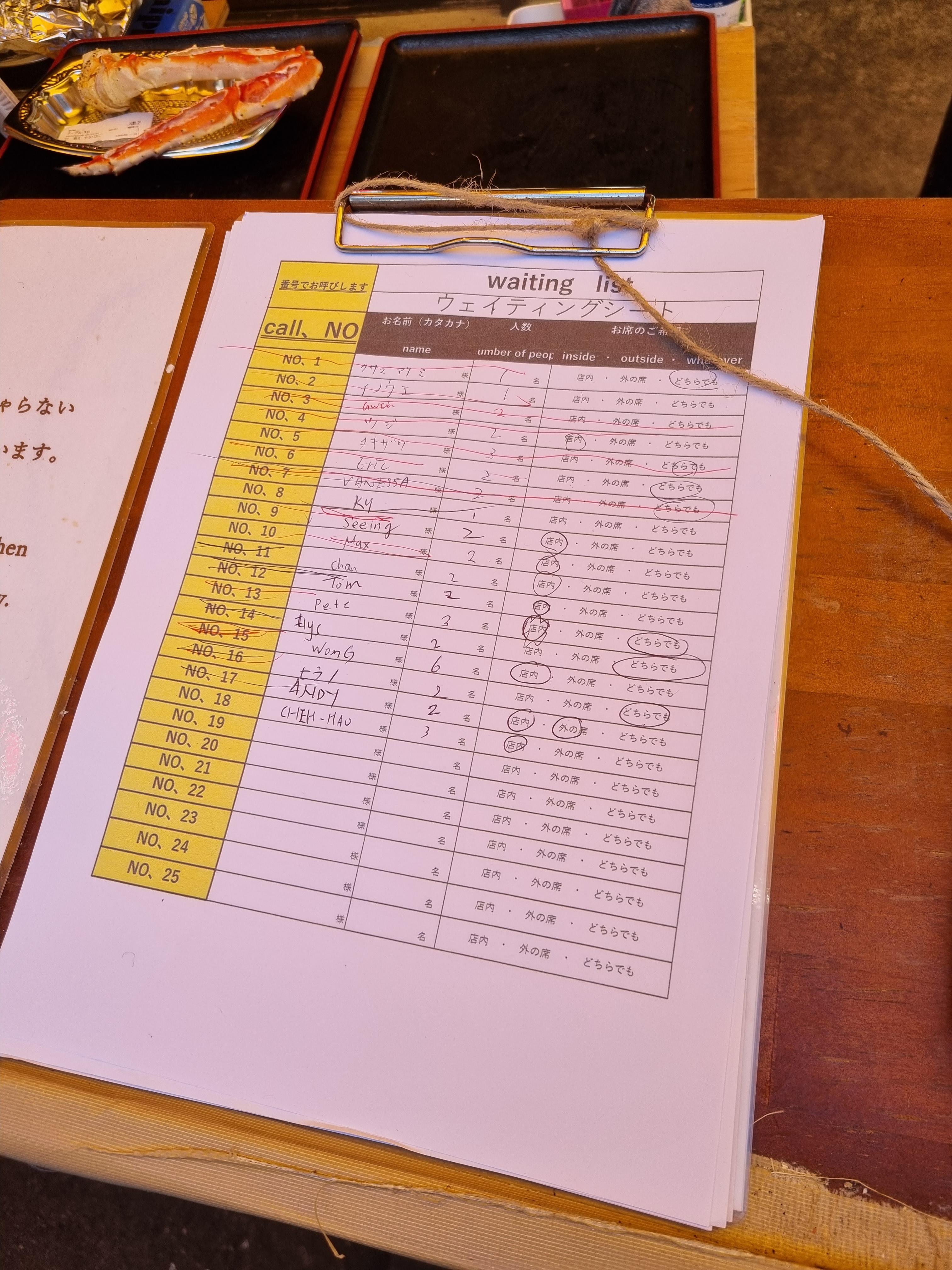 가장 먼저 해산물을 파는 가게에 자리를 잡았어요. 이름을 종이에 쓰면 번호로 불러주셔요.